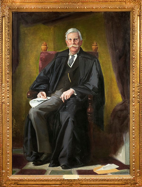 This is an official portrait of Oliver Wendell Holmes, Jr., a past Associate Justice of the United States Supreme Court. Justice Holmes also served as a brevet colonel in the Union Army in the United States Civil War, wounded several times. He served on the Court until retiring at age 90. His physician/poet/inventor father authored, “Old Ironsides”, an ode to USS Constitution, saving the old hero from a rusty doom.